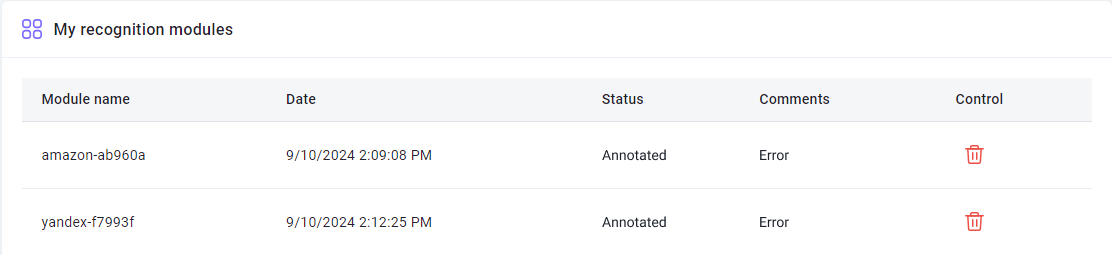- Submit tasks for recognition, specifying the name of the created module.