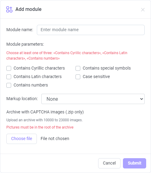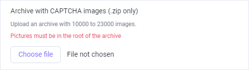 When you specified the module name, selected symbol types, and location of answers, you need to upload the zip archive with the captchas and send us.