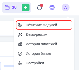 Чтобы перейти на страницу обучения модуля, кликните по вашему email в верхней правой части сайта и выберите соответствующий пункт меню.