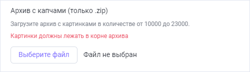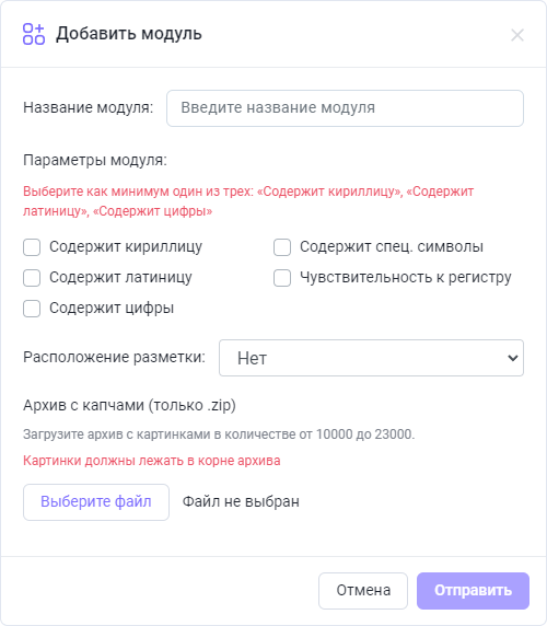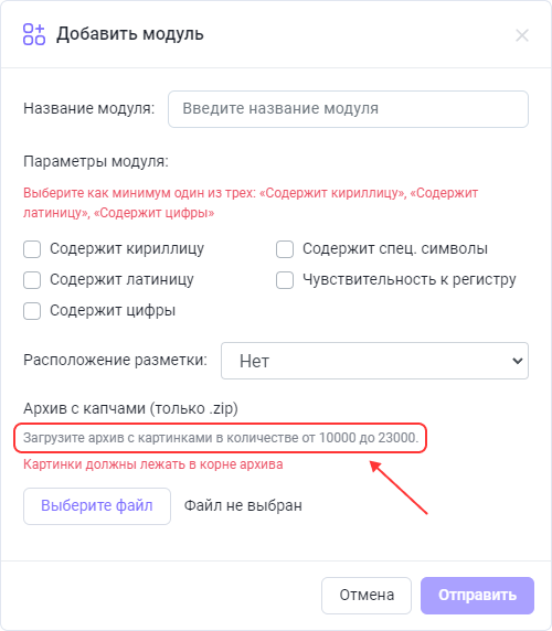 После того как вы указали имя модуля, выбрали типы символов и расположение ответов, осталось только загрузить zip-архив с капчами и отправить нам.