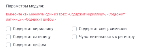 В этом списке обязательно должен быть отмечен один из пунктов (или несколько): "Cодержит кириллицу", "Содержит латиницу", "Содержит цифры"