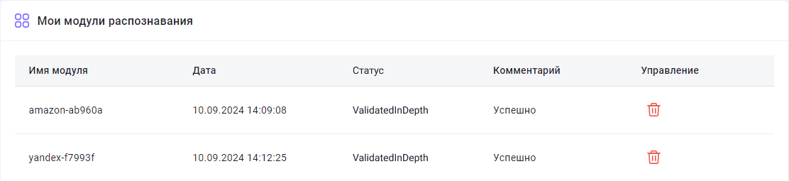 В этой колонке отображается кнопка «Удалить» только для модулей со статусом Validated.