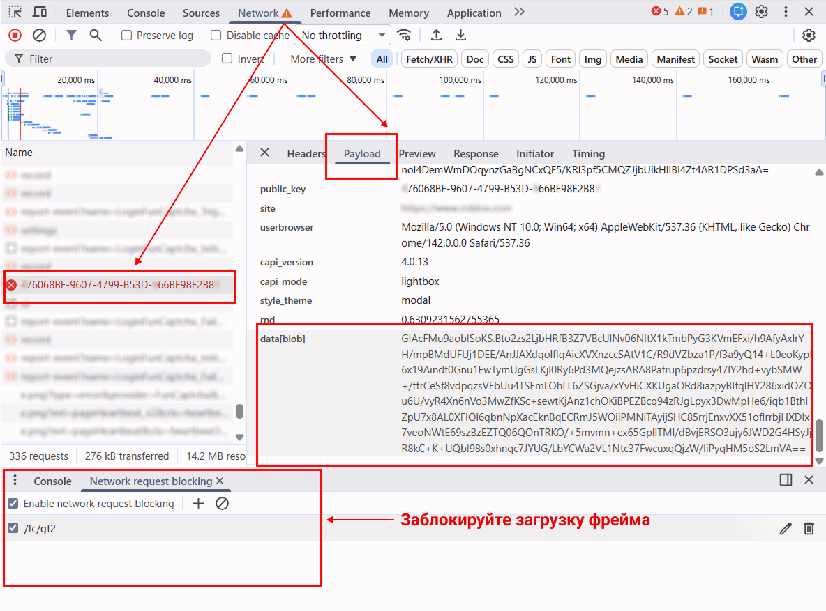 2. Заблокируйте загрузку iframe с капчей, чтобы получить валидный blob. Для этого нажмите Ctrl + Shift + P (в Chromium-браузерах), введите Enable network request blocking, включите блокировку и добавьте паттерн вида: /fc/gt2