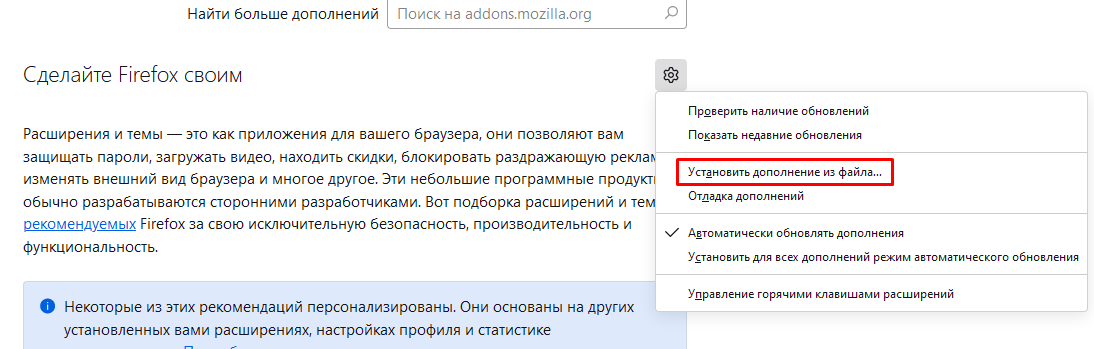 3. Нажмите кнопку шестеренки, в открывшемся выпадающем списке выберите пункт Установить дополнение из файла…