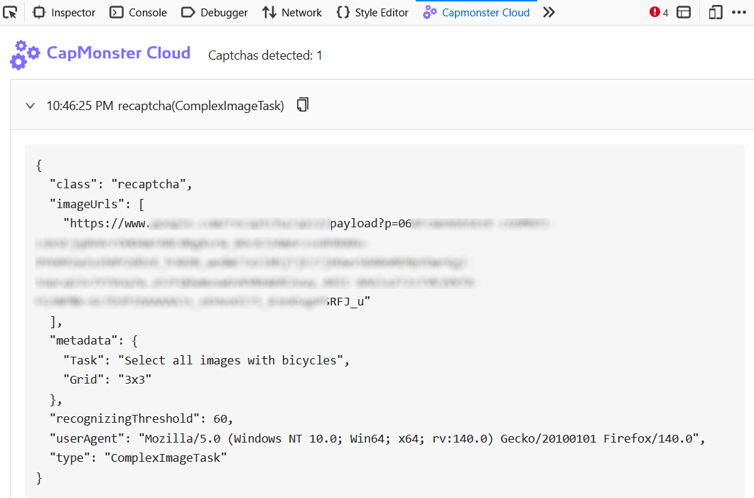 Расширение CapMonster Cloud предоставляет удобный способ просмотра параметров различных типов капч, необходимых для их правильной отправки на сервер и успешного решения. Отображаемые данные позволяют убедиться в корректности передаваемых параметров и могут использоваться в качестве примера при формировании ваших API-запросов.