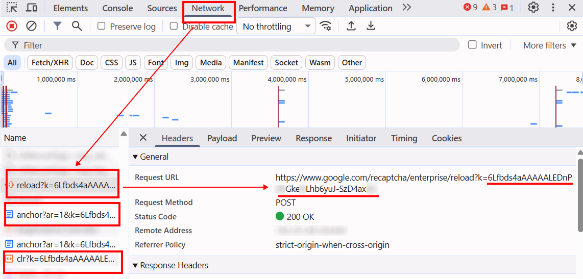 这些 URL 中的 k 参数即为所需的 websiteKey。