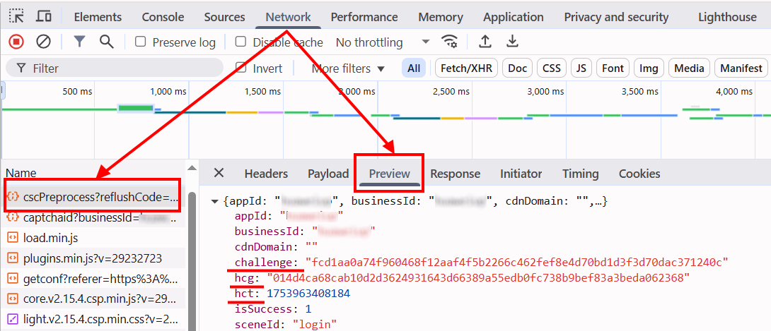 这些参数都可在网络请求中找到。相关请求通常以 cscPreprocess?reflushCode= 开头。